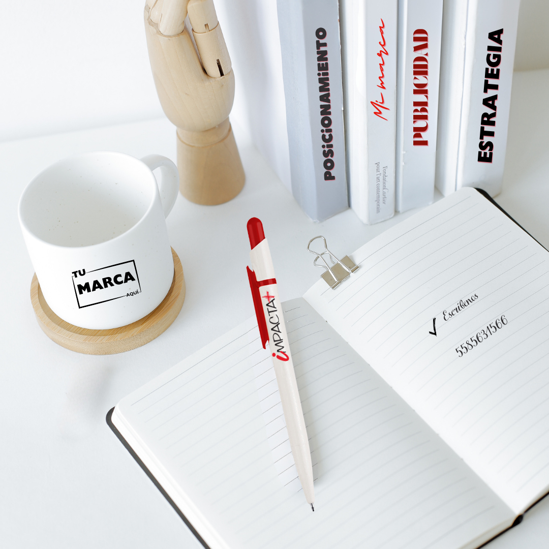 Bolígrafo de plástico cuerpo blanco, tapón y clip de color. Mecanismo de click.